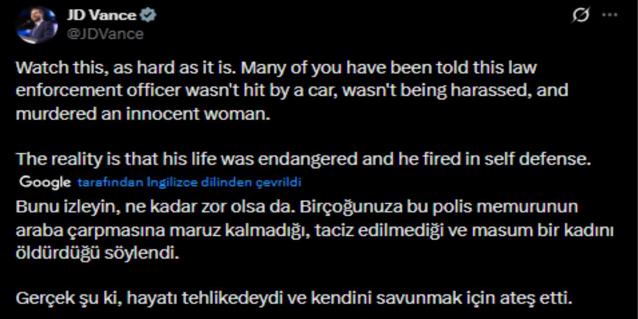 Vance, paylaştığı videonun altına “Çoğunuza bu polis memurunun masum bir kadını öldürdüğü söylendi. Gerçek şu ki, hayatı tehlikedeydi ve kendini savunmak için ateş etti” yorumunu ekledi.