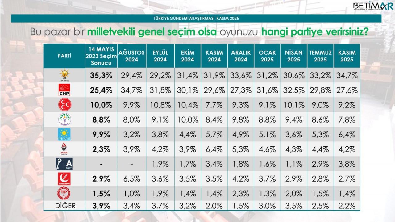 Son iki seçimin sonuçlarını doğru tahmin eden araştırma şirketlerinden BETİMAR, Kasım 2025 anket sonuçlarını açıkladı.
