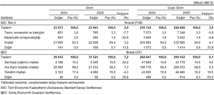 Ekim ayında ihracatta imalat sanayinin payı yüzde 94,4, tarımın payı yüzde 3,3, madenciliğin payı yüzde 1,6 oldu. İthalatta ise ara malları yüzde 68,3, sermaye malları yüzde 16, tüketim malları yüzde 15,5 pay aldı.