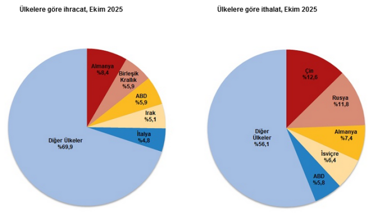 İthalatta ise ilk sırada 3,9 milyar dolarla Çin yer aldı; Rusya, Almanya, İsviçre ve ABD onu takip etti. İlk beş ülke toplam ithalatın yüzde 43,9’unu oluşturdu.