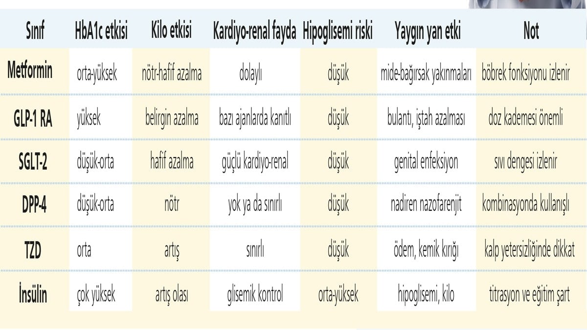 Aşağıdaki özet karar verirken yol gösterir, her hasta için bireysel değerlendirme yapılır. (Kaynak: American Diabetes Association, European Association for the Study of Diabetes, New England Journal of Medicine)