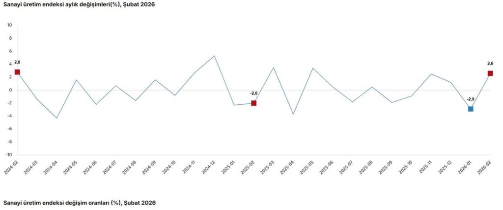 Türkiye İstatistik Kurumu (TÜİK), 2026 yılı Şubat ayında sanayi üretiminin yıllık bazda yüzde 2,2, aylık bazda ise yüzde 2,6 oranında arttığını duyurdu. TÜİK, bu döneme ilişkin sanayi üretim endeksi verilerini kamuoyuyla paylaştı. Verilere göre, Şubat 2026’da sanayi üretimi, bir önceki yılın aynı ayına göre yüzde 2,2 oranında artış gösterdi.