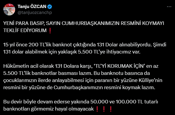 Özcan, sosyal medya hesabından yaptığı paylaşımda TL’deki değer kaybı karşısında yeni bir banknot basma çağrısında bulunurken, yeni banknoktun üstüne Cumhurbaşkanı ve AKP Genel Başkanı Recep Tayyip Erdoğan’ın resmnini koymayı teklif etti.