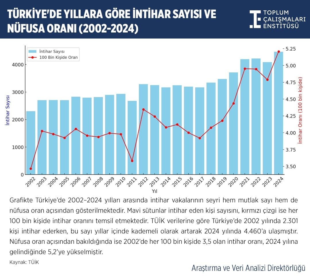 Türkiye’de son dönemde art arda yaşanan intihar vakaları, konuyu yeniden kamuoyunun gündemine taşıdı. Toplum Çalışmaları Enstitüsü’nün yayımladığı verilere göre, 2002 yılında 2 bin 301 olan intihar sayısı, 2024’te 4 bin 460’a ulaştı.
